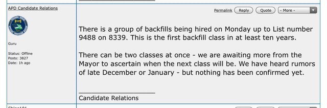 The 16 backfills were sworn in today per my academy source. (Thanks Truthseeker for the intel) The December recruit class is confirmed. As well as a January recruit class. Promotions is slated for January bmoc of sgts. I did not hear anything about Lt's promotions as of yet.