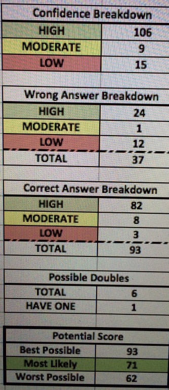 Carol, my numbers were around the same as you. I felt a lot more comfortable after I went through each question one by one and compared it to the other answers. I determined that at MAX I would have 28 wrong out of 130. About 5 of those were 50/50 on the answers, and just by normal percentages at least a few of my wrong answers had to be part of the research questions. I felt like I was on the 70 bubble with the initial number thrown out there, but now I feel that I am comfortably around 80.
