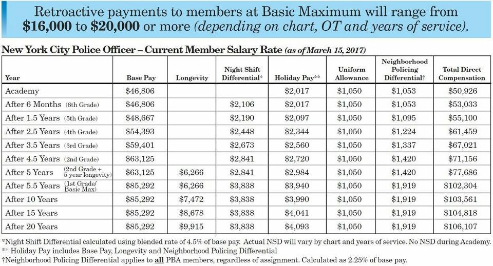 as it was explained to us when the Lt from Labor Relations spoke to my group a few weeks ago...if at the time of your promotion, you got a raise, that's all that matters. If the PBA ends up doing better and their top step surpasses the SBAs bottom step, the city doesn't care...the SBA signed a contract with no re-opener clause and the city feels it is honoring its contractual obligations. I haven't gotten a paycheck with the new pay scale yet but was led to believe that we would be brought to step 4( the step before top pay) since that is the first step that gives us a raise( similar to the idea of why detectives go straight to top pay). The Lt also said that the 2.25% Neighborhood Policing differential that the PBA got counts as salary in this evaluation. Whether we go straight to top pay(the next step) after our one year anniversary or the city figures some other resolution out I have no clue. I directly benefit from this and I feel it is insane. If the SBA were actually able to sucessfully resolve the issue and just raise all the steps to accomodate the new PBA top pay, I'd sign on. However, the city won't give us anything for free and I wouldn't be willing to give much up for that. Hope this helps, this what we were told. I dont understand why the city wouldn't want to fix this...you're talking 100s of new sergeants going to top pay potentially 3 years early...70ish thousand dollars times 3 years times the 100s of sergeants benefiting from it. if the city decides just to hold us at step 4 for 4 years, then its almost a non-issue as we would only be making about 2 thousand more than sergeants promoted before the PBA contract went into effect.