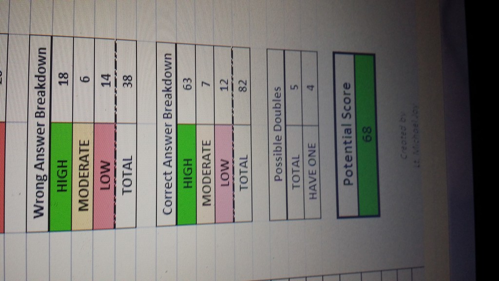 I removed the "Best Possible" and "Worst Possible" fields as they don't really happen and it leaves a lot of ambiguity. If you have never used this before, download the file and plug in your answers on the left. It will display what your estimated score is on the lower right, as well as provide a breakdown on the questions by assigning a confidence level. This is generated by looking at the disparity between people's answers. High confidence means that most people chose a particular answer so that is likely the correct one. Medium is a middle ground, and low means that it can be very close. Possible doubles are when two or more answers are neck and neck.