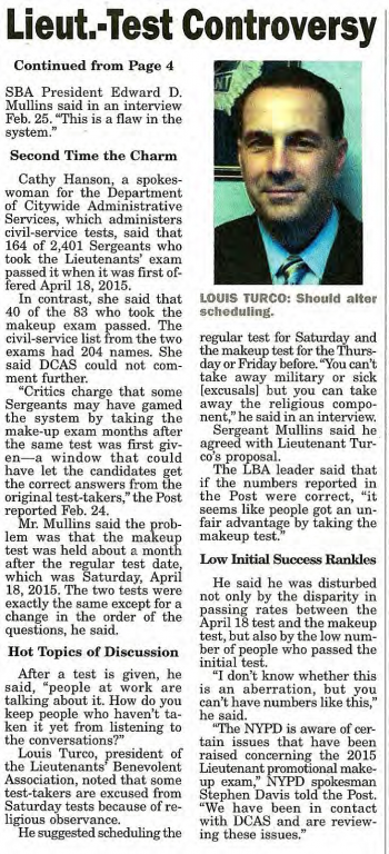 Louis Turco, president of the Lieutenants Benevolent Association, noted that some test-takers are excused from Saturday tests because of religious observance.