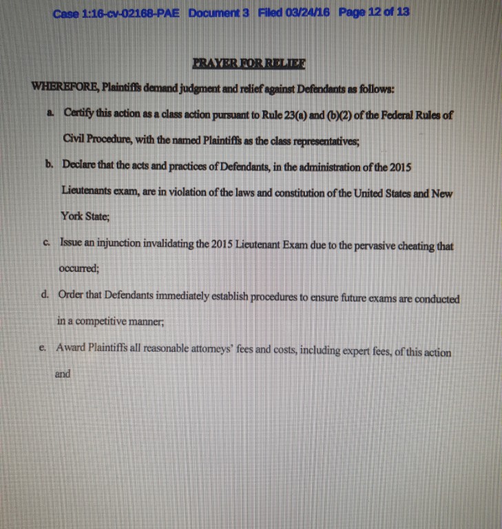 Point 50 Accordingly, I, individually, and on behalf of the proposed class, am requesting an Order from this Court enjoining the NYPD from issuing any promotions based on the results of the Lieutenant's Exam, and the resulting Eligible List, until the investigation into the cheating allegations is complete.