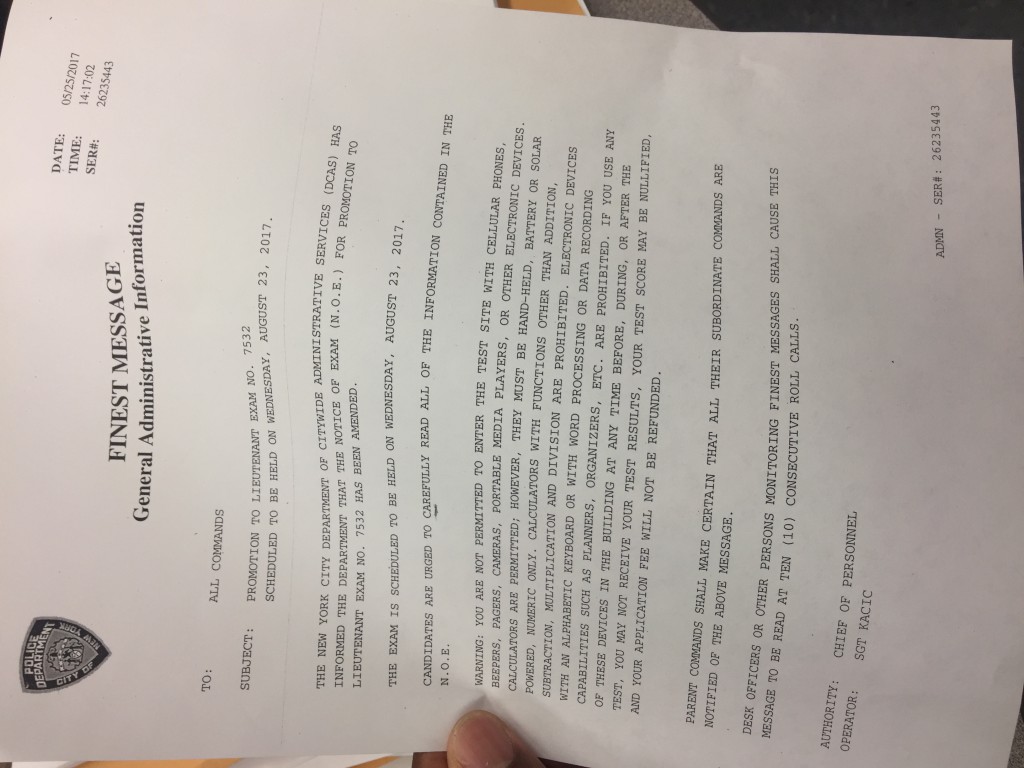 The Notice of Examination is amended to change the date of the multiple-choice test from August 16, 2017 to August 23, 2017 and to update the SENIORITY CHART accordingly.