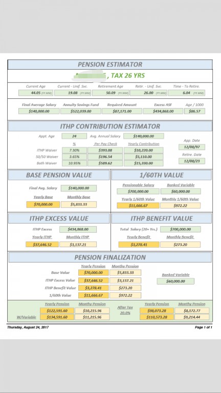 If you play your cards right on this job and do the now extinct ITHP/50%, guaranteed 8.25% compounded over a career (25-30 years), you will be quite wealthy. Contribute to these things on top of maxing out your 457, 401k and IRA... And you will be rich. Easily multi-millionaire status. People who know about money; the time value of money, and investing w/compound interest would KILL to have our pension, 457, and 401k. I attached a recent work up from the pension section for a buddy whose coming up on 20, and trying to figure out if he's staying or going... Keep in mind, these numbers don't factor in any future raises which obviously increase base salary, night diff rate, overtime rate... Which will increase ITHP/50% contributions, and 1/60th post 20.... which will increase the pension even further. The numbers get really crazy after 20 if you know what you're doing...