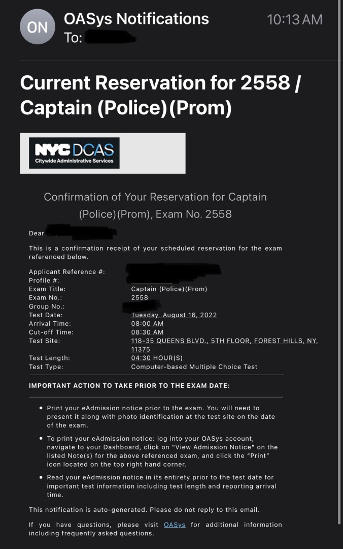 This should not be hard for DCAS to figure out.. ONLY 500 people eligible and will sit and take exam. The right thing to do: once individual is done taking the exam, escort each individual to an empty/different room AND not allow them to use their phone. Hold them until 3:30pm, which is when session two is seated. Keep the scores. The job needs Captains soooo bad, that first class will go in before end of this year. And I no math magician, but I anticipate 50 getting made to Captains before end of this year.. Is my number off by a lot?