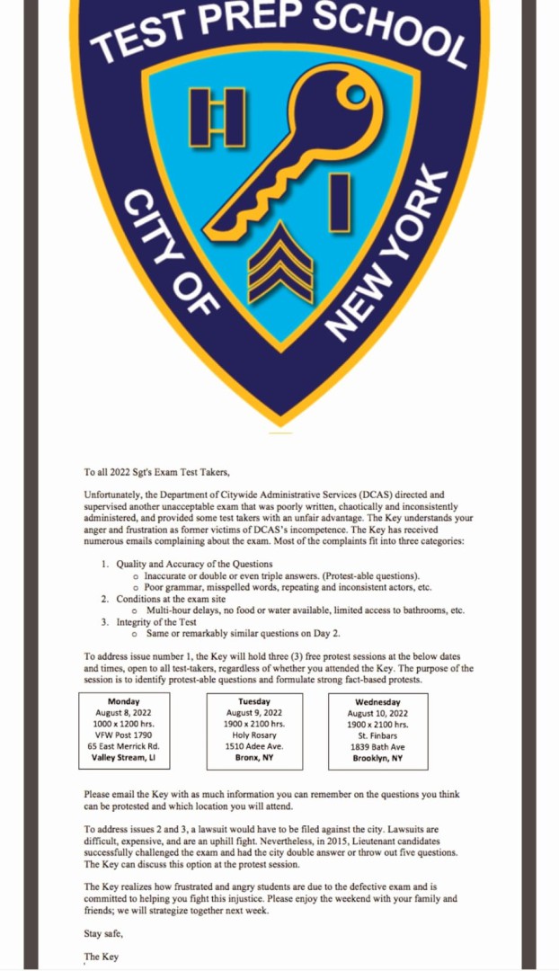 Participating in the protest session is the only was to expose DCAS' incompetence! The difference between The Key's protest sessions and the discussion that occurred after the 2015 lieutenant exam is that it is live and in person--and not virtual. The scammers are trolling the forum and quietly gathering information; they will not be bold enough to appear at an in-person session!