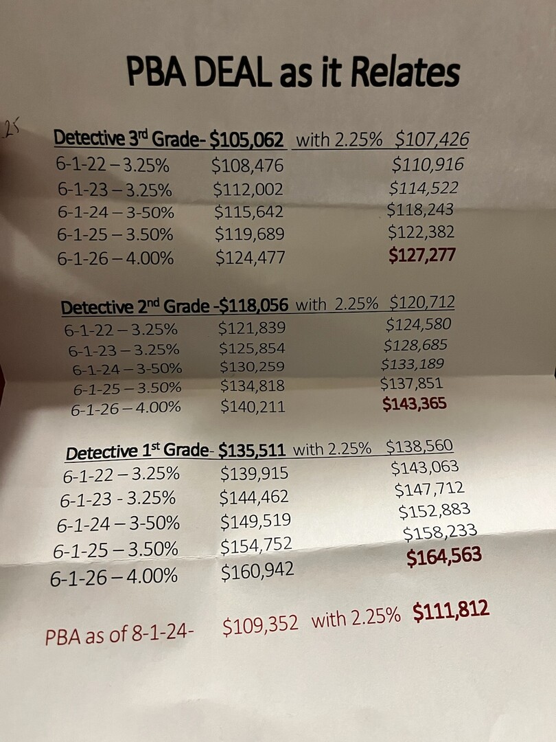 First is how they are calculating your pay at the time of promotion. The amount they are basing it off is the total of your 80 hours multiple by the 26 pay weeks. Where the PBA has the 2.25% added as a differential, all the DEA decided to add it as your final raise when you hit 5 years in rank. If you are below 5 years in rank, with the current DEA contract you are at (119,689). Meaning you need to have 5 years in rank to have the 2.25% making your DEA salary (122,382) which would get you over the 5th Sgts step (120,600) to be bumped up to top pay (134,819) when you get promoted.